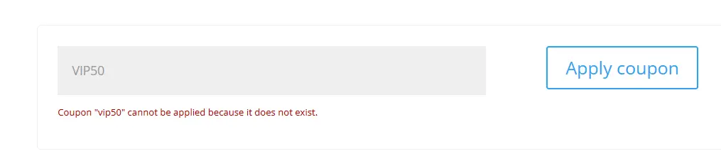 - Enter VIP50 → no discount (inactive), error “code not valid”