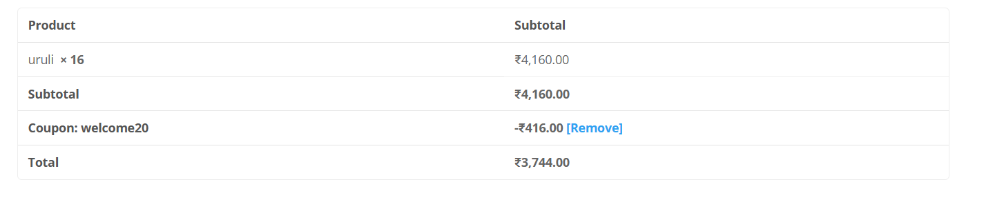 - WELCOME10: 10% off, min ₹1000, customer type “new”, status active
