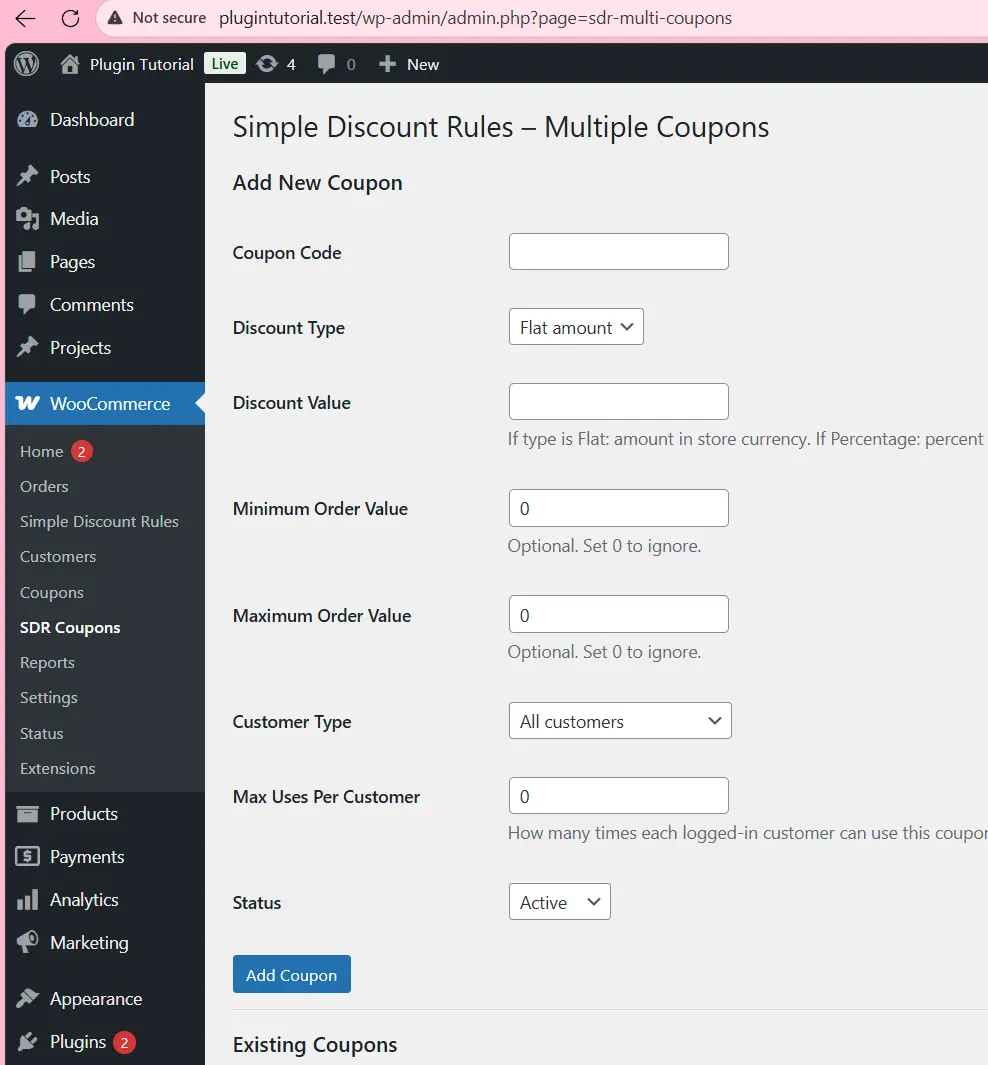 In `sdr_render_settings_page()`, inside the **ADD NEW COUPON FORM** table, add this row before the “Status” row: